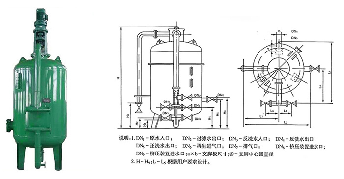 結(jié)構(gòu)簡(jiǎn)單:主要由以下部分構(gòu)成:配套管線和閥門,其中過濾器體又包括:筒體、反洗氣管、布水組件、支撐組件、濾料、排氣閥(外置)等